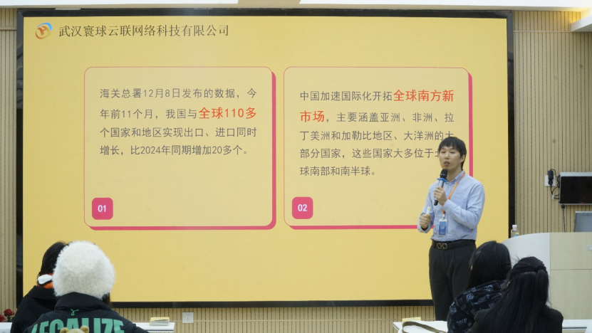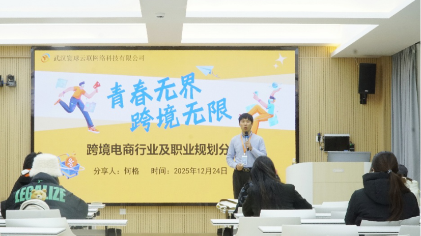 为助力外语类学子精准把握行业动态,明晰跨境电商领域职业发展方向,搭建理论与实践衔接桥梁,12月24日,hg皇冠官网特邀武汉寰球云联网络科技有限公司在院内开展跨境电商行业分享交流会。英语系员工陈培、辅导员王立及英语、翻译专业50余名本科生参与活动。